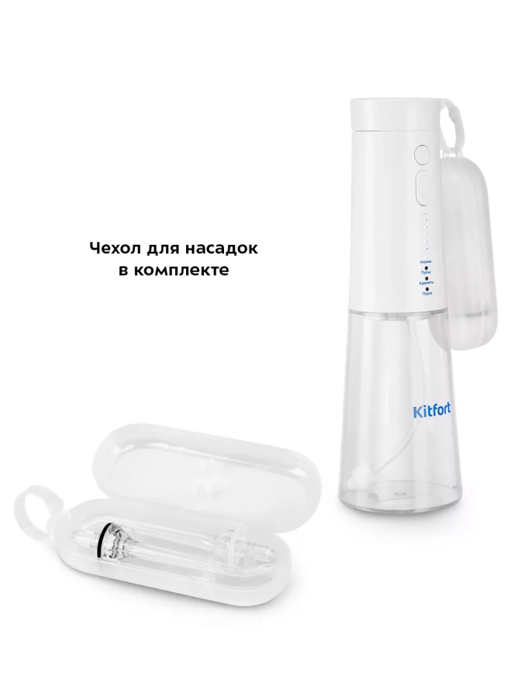 Модель Kitfort KT-2986 является портативным ирригатором, его можно брать с собой в путешествия или на работу — он с легкостью поместится в небольшую сумку. В комплекте есть кейс для насадок и чехол, в котором удобно хранить и перевозить устройство.