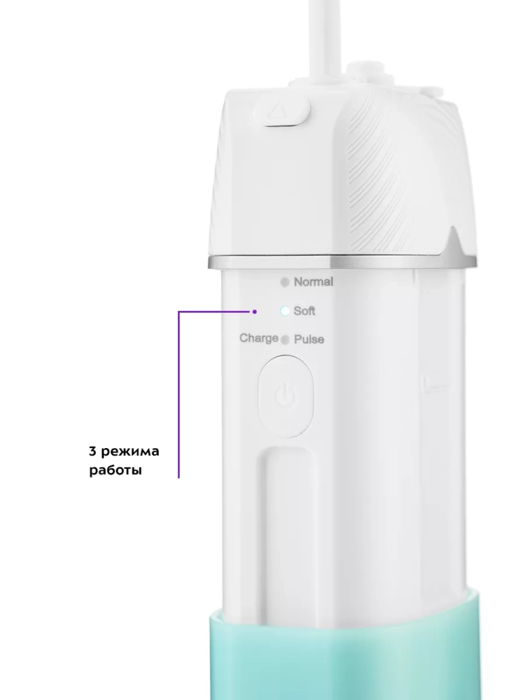 У ирригатора три режима работы — «Нормальный», «Мягкий» и «Массаж». Если вы до этого не пользовались ирригатором, начните с режима «Мягкий», т.к. неподготовленные и чувствительные десны могут начать кровоточить из-за сильного и тонкого потока воды. Когда десны привыкнут и окрепнут, вы можете переходить на режим «Нормальный», а затем и режим «Массаж».
