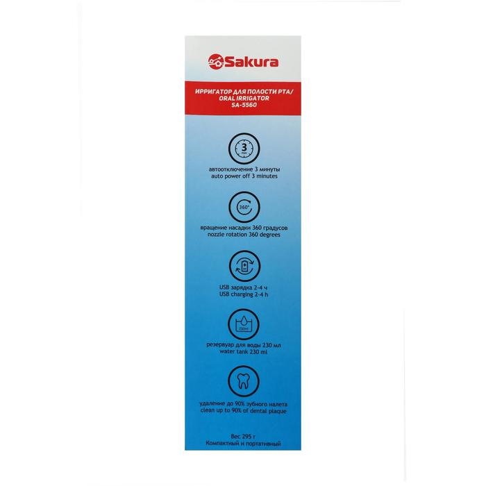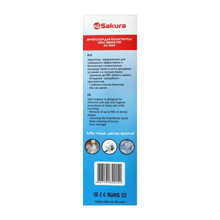 Ирригатор Sakura SA-5560, портативный, 230 мл, 3 режима, 1200 импульсов/мин, АКБ