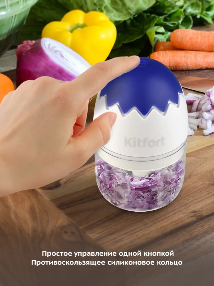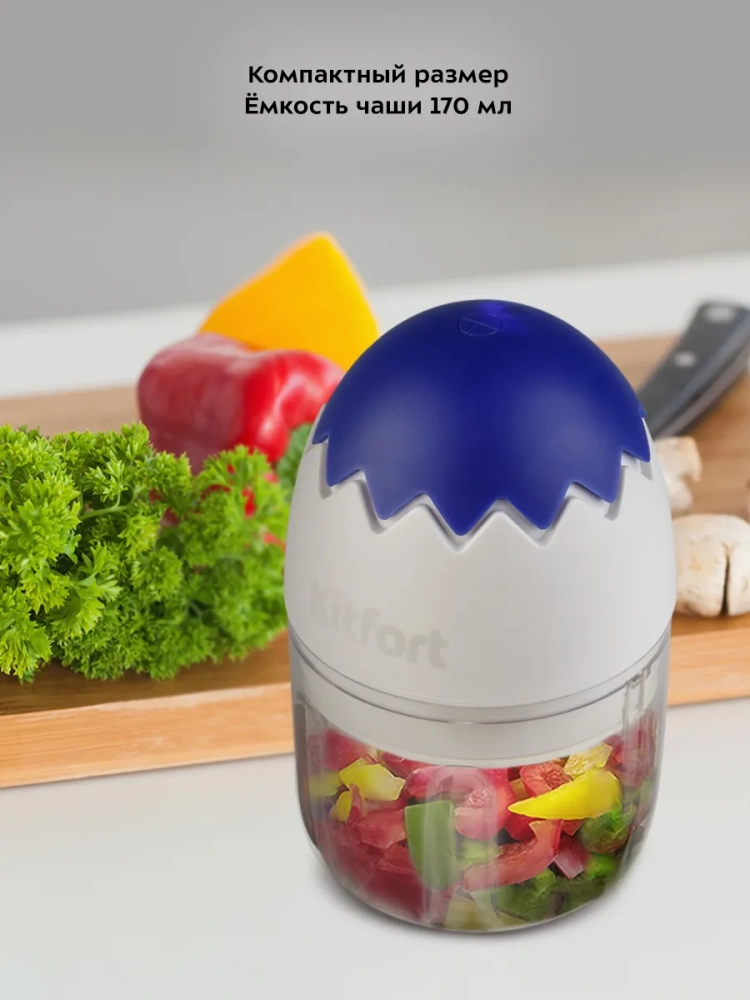 Портативный измельчитель Kitfort КТ-3091 — устройство для быстрого измельчения мяса, твердого сыра, овощей, трав, чеснока, ягод и многих других продуктов. КТ-3091 работает от аккумулятора и заряжается от USB. Он незаменимый помощник для приготовления домашнего детского питания, супов-пюре и множества других блюд. Перед смешиванием все ингредиенты необходимо порезать на кусочки. Тройной нож измельчает ингредиенты практически по всей высоте чаши. Процесс измельчения пищи происходит намного быстрее, чем при использовании ручных кухонных приспособлений. Простой кухонный нож для ручной нарезки и измельчения не выдерживает никакой конкуренции с этим устройством. Любой салат будет готов за считанные минуты. Все что потребуется — подготовить продукты для резки и следить за степенью измельчения. Чаша измельчителя выполнена из прозрачного пластика, что дает возможность наблюдать за процессом и контролировать степень измельчения. Для обеспечения безопасности КТ-3091 может работать только с правильно установленным моторным блоком на чаше. Благодаря силиконовому кольцу, которое встроено в дно чаши, измельчитель меньше скользит по столу, а также дополнительно снижается вибрация и уровень шума при работе. Управление прибором осуществляется нажатием на кнопку, расположенную на верхней части моторного блока. Степень измельчения продуктов регулируется длительностью нажатия на кнопку. У прибора есть автоматическое отключение через 30 секунд работы. Измельчитель — это устройство, которое отлично подойдет для ежедневного использования. С помощью него можно без лишних усилий подготовить ингредиенты практически для любого блюда. К тому же он занимает мало места, его очень легко и быстро мыть, а также удобно перевозить с собой.