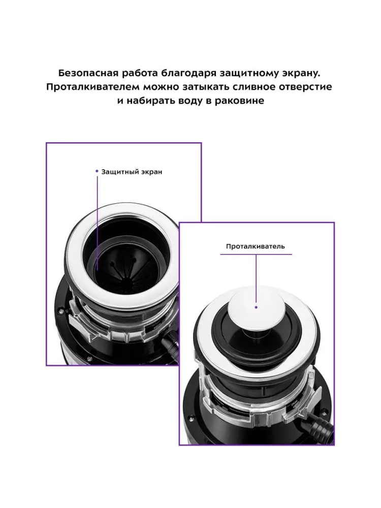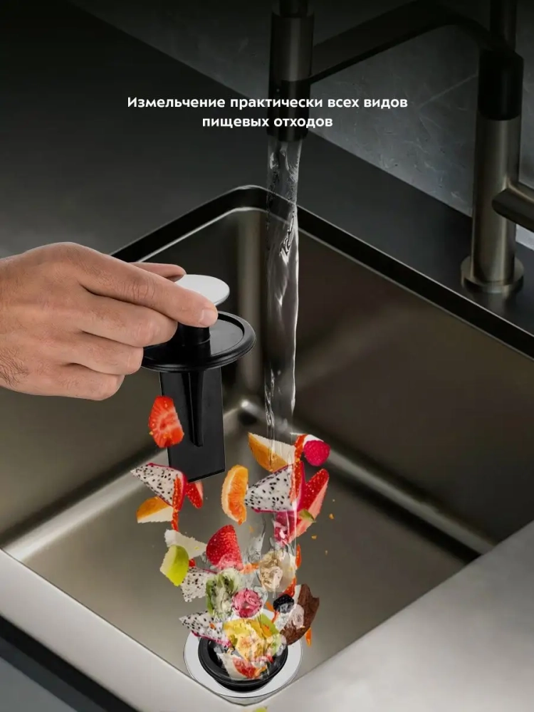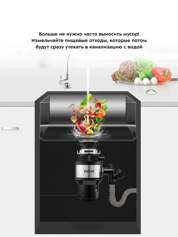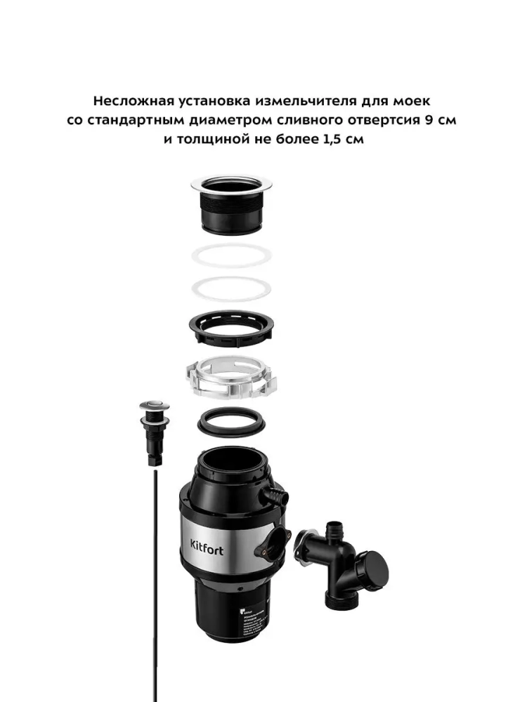Измельчитель отходов Kitfort KT-2090 — устройство, предназначенное для установки под мойку и измельчения пищевых отходов. Пищевые отходы измельчаются на маленькие частицы и затем беспрепятственно утекают в канализацию с водой. Измельчитель отходов способен избавить от скопления большого количества отходов и потребности часто выносить мусор, неприятных запахов из мусорного ведра и засора канализации. Измельчитель пищевых отходов подходит практически для всех видов пищевых отходов. Исключение составляют длинные или крупные кости, раковины моллюсков, большие объемы яичной скорлупы сразу, длинные волокнистые продукты, например, целый початок кукурузы или стебель сельдерея. Небольшие кости и отходы от фруктов, наоборот, подходят для переработки в измельчителе отходов и при этом очищают камеру измельчителя. Нельзя измельчать стекло, пластик, металл или другие непищевые продукты. Измельчитель KT-2090 поставляется с проталкивателем, который может служить пробкой для мойки, и пневмокнопкой. Вы можете закрыть проталкивателем сливное отверстие мойки при необходимости набрать воду. Чтобы во время работы измельчителя из камеры не выбрасывало части измельчаемых отходов, в фланец мойки устанавливается защитный экран. Защитный экран также предотвращает попадание в камеру измельчителя посторонних предметов Пневмокнопка устанавливается в столешницу или мойку и не занимает много места на рабочей поверхности. Пневмокнопка позволяет включить и выключить измельчитель даже влажными руками. Установить измельчитель не сложно, однако надо учитывать, что устройство довольно большое и занимает много места в шкафчике под мойкой. Измельчитель KT-2090 подходит для моек с толщиной дна в районе сливного отверстия не более 1,2 см и диаметром отверстия в мойке не менее 8,5 см (стандартные широкие отверстия в мойке обычно составляют 9 см и отлично подходят для монтажа).