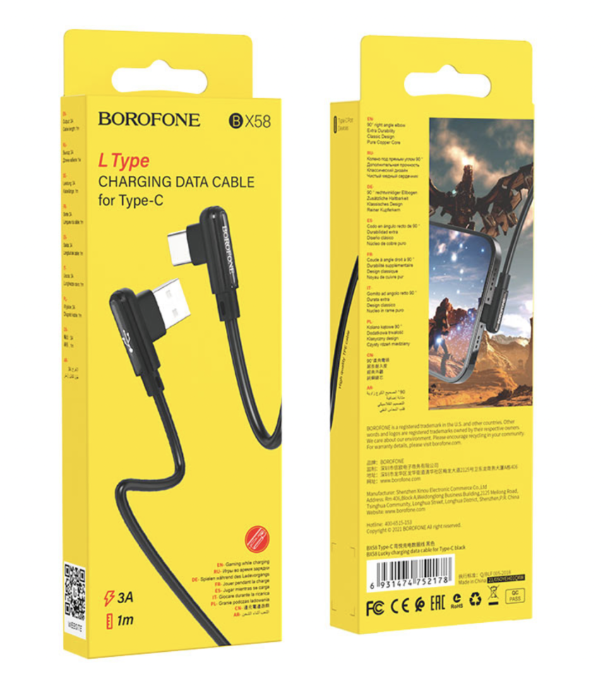 Кабель BX58 USB Type-C 1M 3A Г-образный