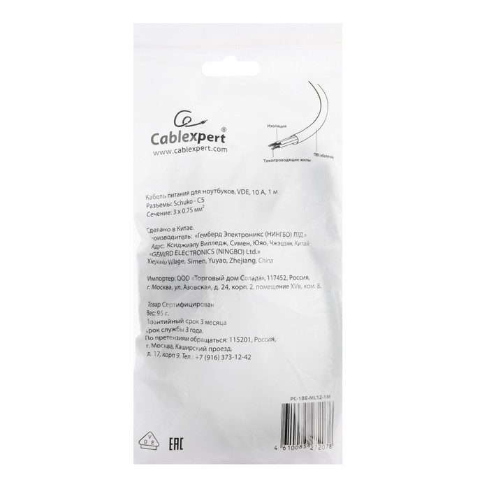 Кабель питания Cablexpert PC-186-ML12-1M, Schuko - C5, 10 А, черный