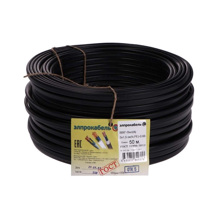Кабель твердый плоский негорючий ПромЭл ВВГп-нг, 3х1.5, 50 м, ГОСТ