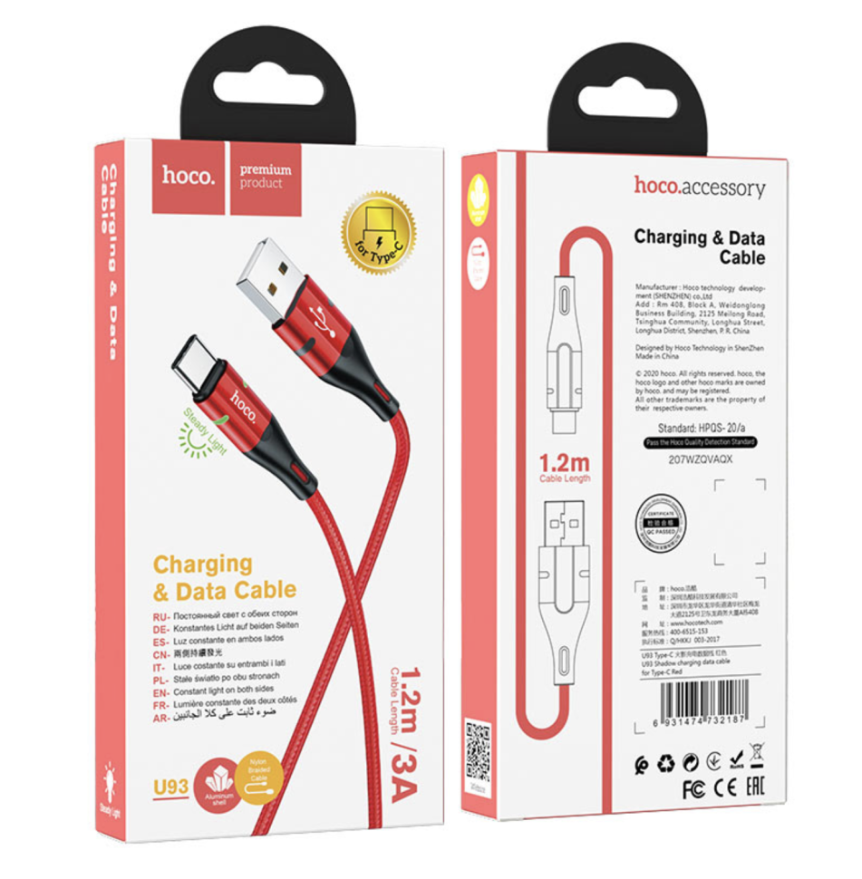 Кабель U93 USB Type-C светящийся 1M HOCO красный