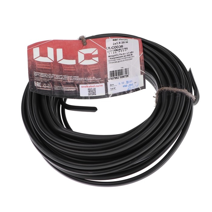 Кабель "ULC" ВВГ-Пнг(A), сечение 2х1.5 мм2, 20 м, ГОСТ, чёрный