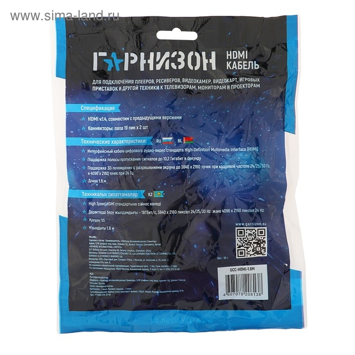 Интерфейсный кабель соединяет два устройства с выходами HDMI. Используйте его для подключения монитора к системному блоку, проектора — к ноутбуку или Blu-Ray плеера — к телевизору. Изделие со спецификацией интерфейса версии 1.4 поддерживает передачу картинки с разрешением 4K, а также 3D-видео. Выводите изображение высокой чёткости с помощью кабеля HDMI.