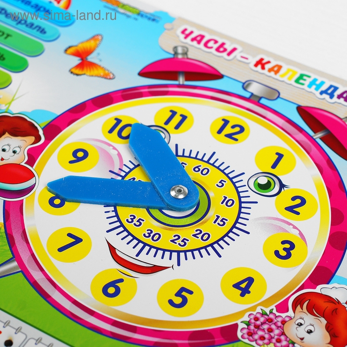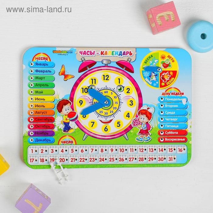 Часы-календарь — это многофункциональная развивающая игрушка для знакомства малыша с понятием времени. Представляет собой красочный деревянный планшет с подвижными стрелками и съёмными пластиковыми деталями-указателями.