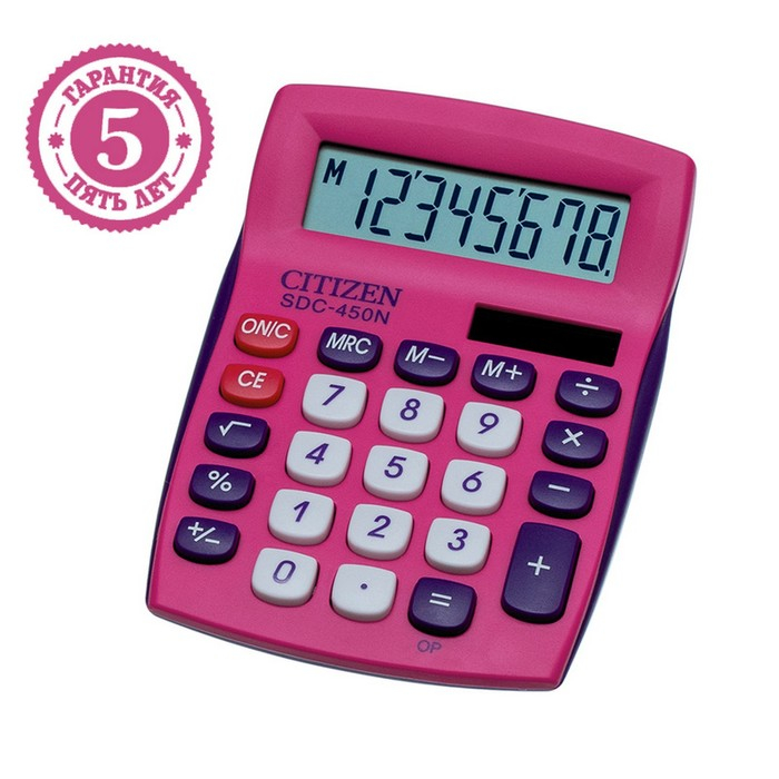 Калькулятор настольный Citizen SDC-450N, 8-разрядный, 120 х 87 х 22 мм, 2-е питание, розовый