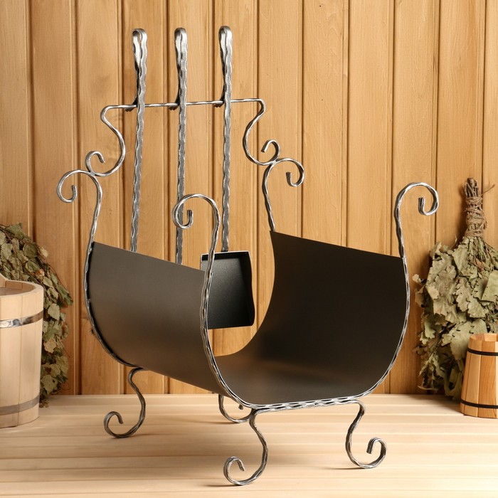 Каминный набор КН-6-21 кованый с дровницей, цвет серебро, 3 предмета: кочерга, совок, метёлка 3000