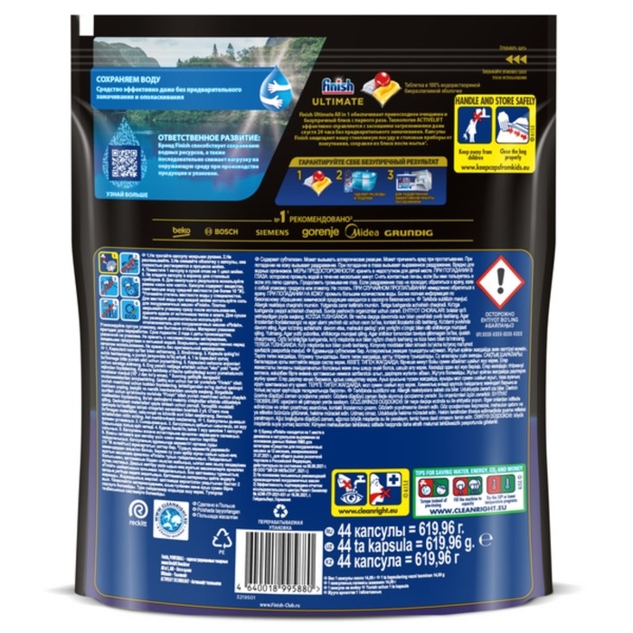 Finish Ultimate All in 1 обеспечивает превосходное очищение и безупречный блеск с первого раза. Технология ACTIVELIFT эффективно справляется с засохшими загрязнениями даже спустя 24 часа без предварительного замачивания. Каждая капсула состоит из трех частей: порошок - удаляет сложные загрязнения, синий гель - нейтрализует жир, красный гель - придает ослепительный блеск. Более того, капсулы Finish Ultimate All in 1 защищают вашу стеклянную посуду и столовые приборы от помутнения, сохраняя их блеск после мытья. Для достижения максимального результата и при очень жесткой воде рекомендуем попробовать специальную соль и ополаскиватель Finish.