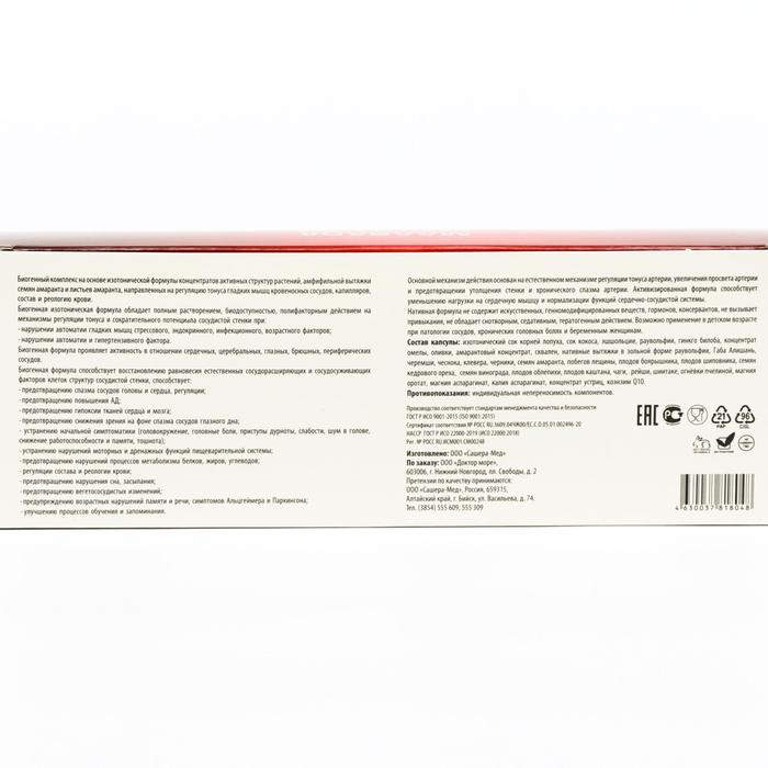 Состав капсулы: изотонический сок корней лопуха, сок кокоса, эшшольции, раувольфии, гинкго билоба, концентрат омелы, оливки, амарантовый концентрат, сквален, нативные вытяжки в зольной форме раувольфии, габа Алишань, черемши, чеснока, гинкго билоба, клевера, черники, семян амаранта, лещины побегов, полов боярышника, плодов шиповника, семян кедрового ореха, семян винограда, плодов облепихи, плодов каштана, чаги, рейши, шиитаке, огневки пчелиной, магния оротат, аспаргинат магния, аспаргинат калия, концентрат устриц, коэнзим Q10.