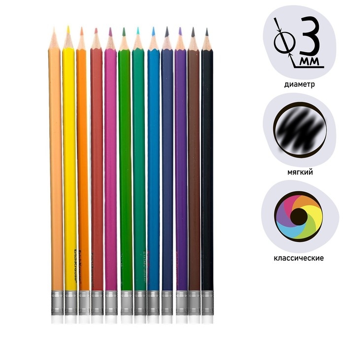 Карандаши 12 цветов ErichKrause ArtBerry премиум, пластик, шестигранные, 3.0 мм грифель, с ластиком, стираемые, картонная упаковка, европодвес