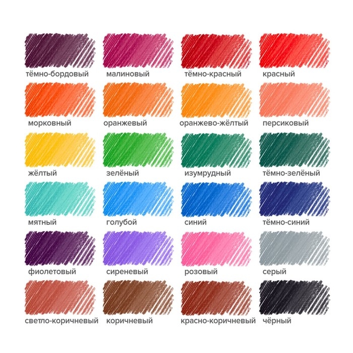 Набор состоит из 24 цветов: малиновый, красный, оранжевый, песочный, бледно-оранжевый, желтый, бледно-желтый, бледно-зеленый, темно-зеленый, аквамариновый, бледно-голубой, голубой, темно-голубой, синий, фиолетовый, сиреневый, темно-розовый, розовый, бледно-розовый, персиковый, коричневый, серо-коричневый, серый, черный. Наконечник дублирует цвет стержня.