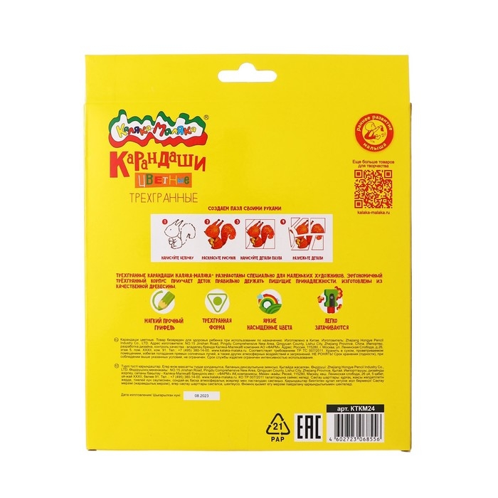 Трехгранные карандаши "Каляка-Маляка"® приучат ребенка правильно держать пишущие принадлежности. Корпус таких карандашей снижает усталость кисти руки и обеспечивает максимальный уровень комфорта во время рисования. Цветные карандаши "Каляка-Маляка"®:- изготовлены из прочной и легкой древесины- имеют идеально отцентрованный мягкий и прочный грифель- не крошатся во время заточки, не ломаются- хорошо ложатся на бумагу, оставляя яркий, устойчивый к выцветанию след- покрыты лаком, предотвращающим от рассыхания корпуса.