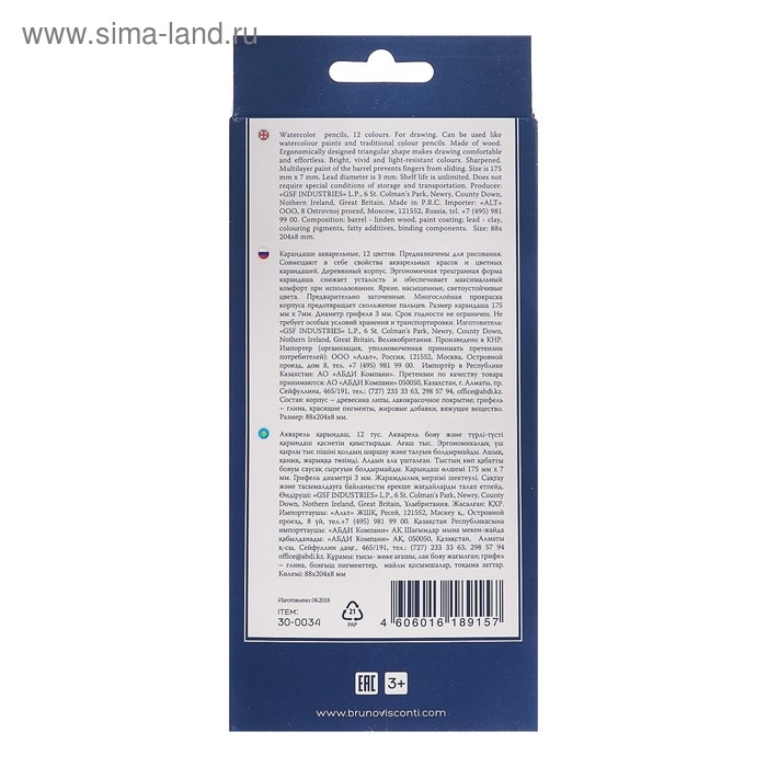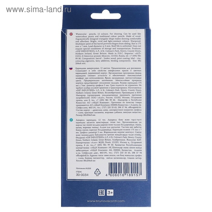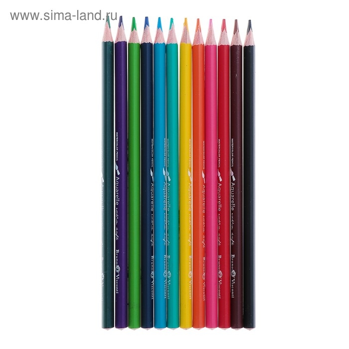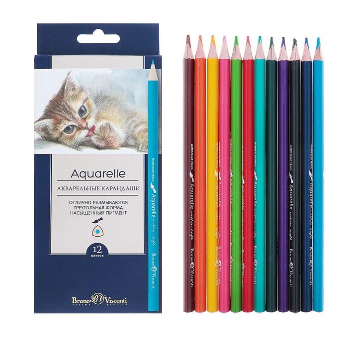 Карандаши акварельные 12 цветов BrunoVisconti Aquarelle, трёхгранные