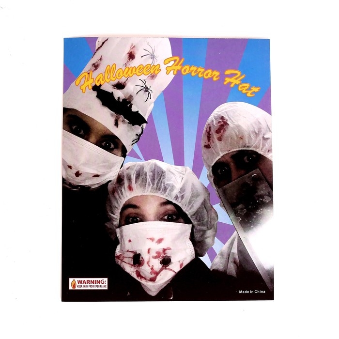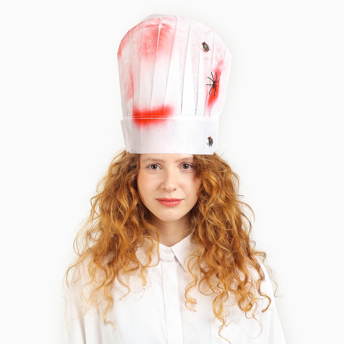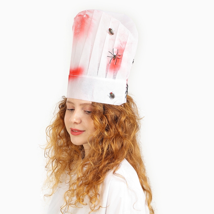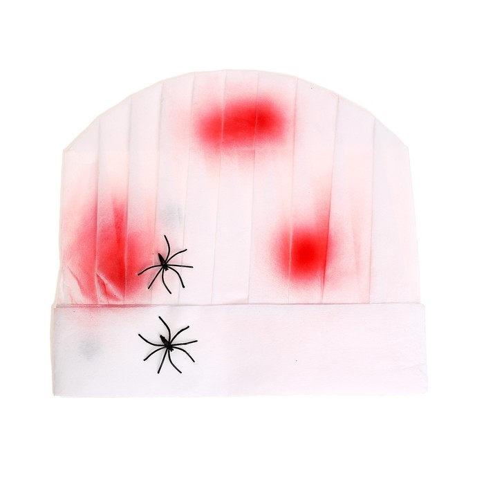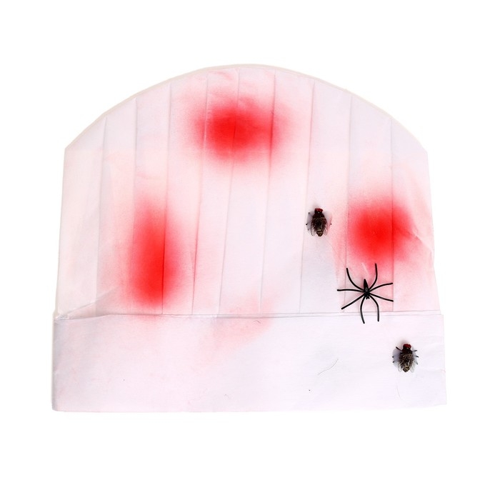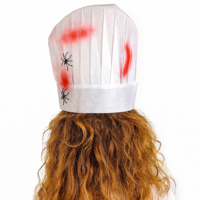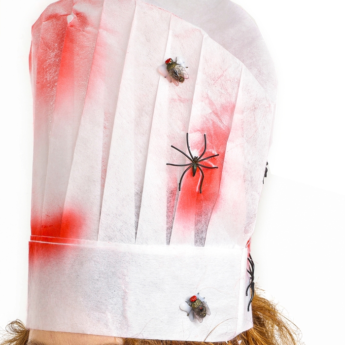 Шапка выполнена из плотного текстиля и декорирована фигурками мух и пауков, которые придают головному убору жуткий вид. Дополните образ кровожадного мясника и станьте самым ярким персонажем на вечеринке!