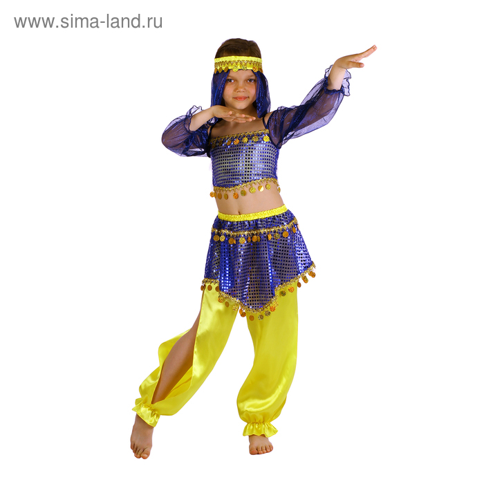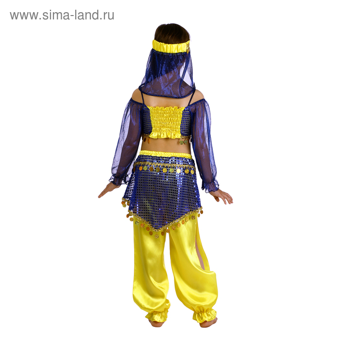 Карнавальный костюм "Восточная красавица. Шахерезада", топ с рукавами, штаны, повязка, цвет сине-жёлтый, р-р 30, рост 110-116 см