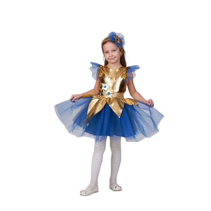 Детский карнавальный костюм «Звёздочка» – это настоящий праздник для девочки. Нежное платье с золотыми звёздами и пышная синяя юбка создают волшебный и воздушный образ, который напоминает о ночном небе.