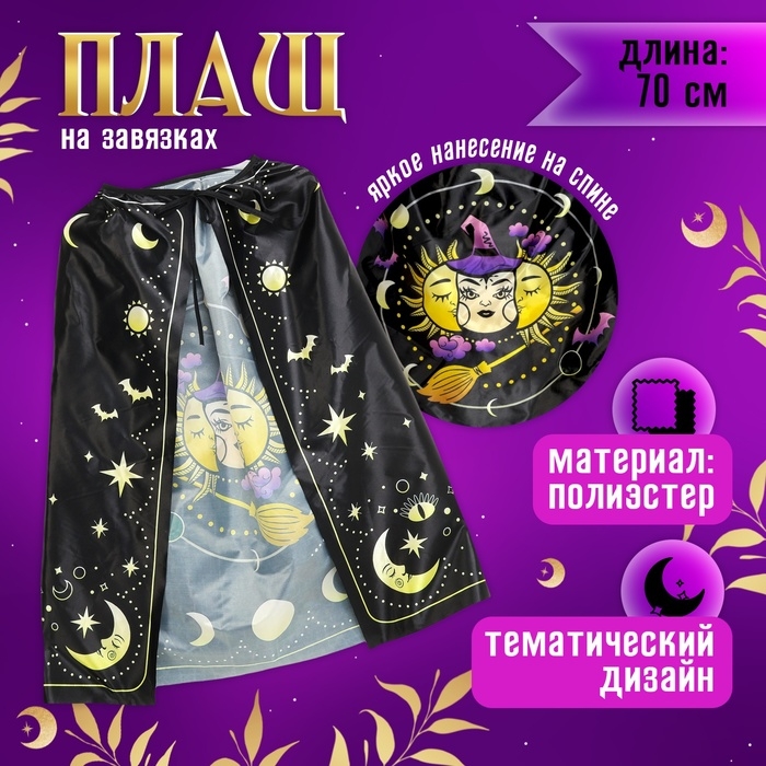 - Плащ длинной 70 см, из мягкой ткани с тематическим дизайном, создаст атмосферу загадочности и таинственности. Плащ на завязках, что обеспечивает комфортную посадку
