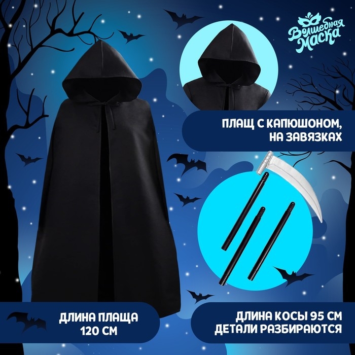 С набором «Ночной кошмар» вы станете настоящей звездой на тематической вечеринке и поразите всех гостей! С ним вы составите полноценный образ, ведь в комплекте есть плащ и коса. Создавайте яркие эмоции и воспоминания на целый год вперёд!