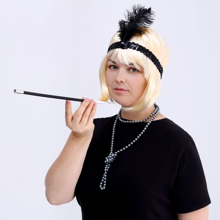 Карнавальный набор — стильный аксессуар, который поможет создать неповторимый образ для тематической вечеринки. Комплект включает в себя элегантную повязку на голову с роскошным пером и изысканный мундштук. Чёрный цвет придает образу загадочности и шика.