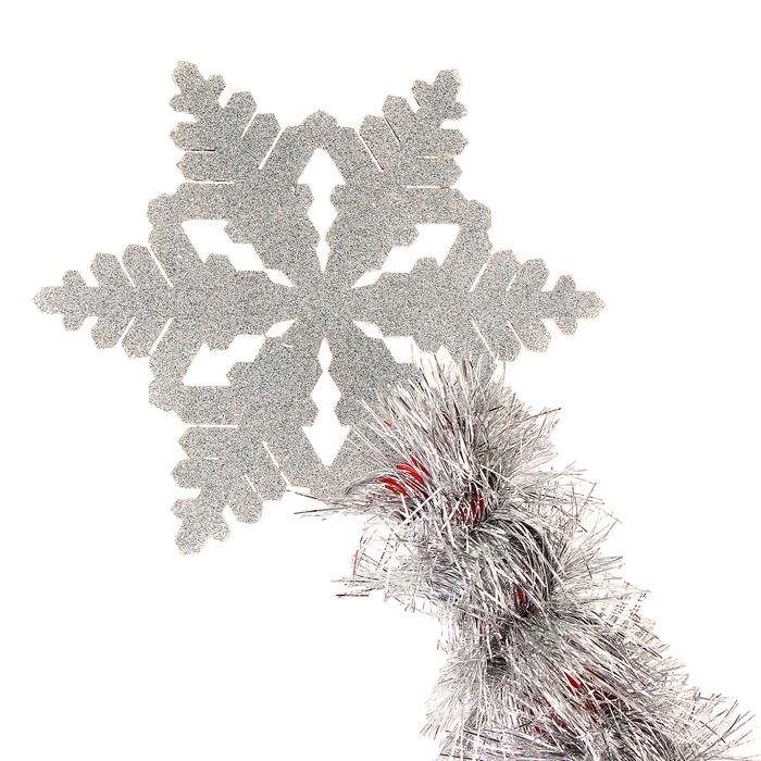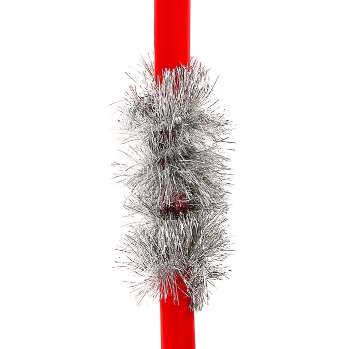 - Посох украшен крупной блестящей снежинкой и серебристой мишурой, создавая праздничное настроение.