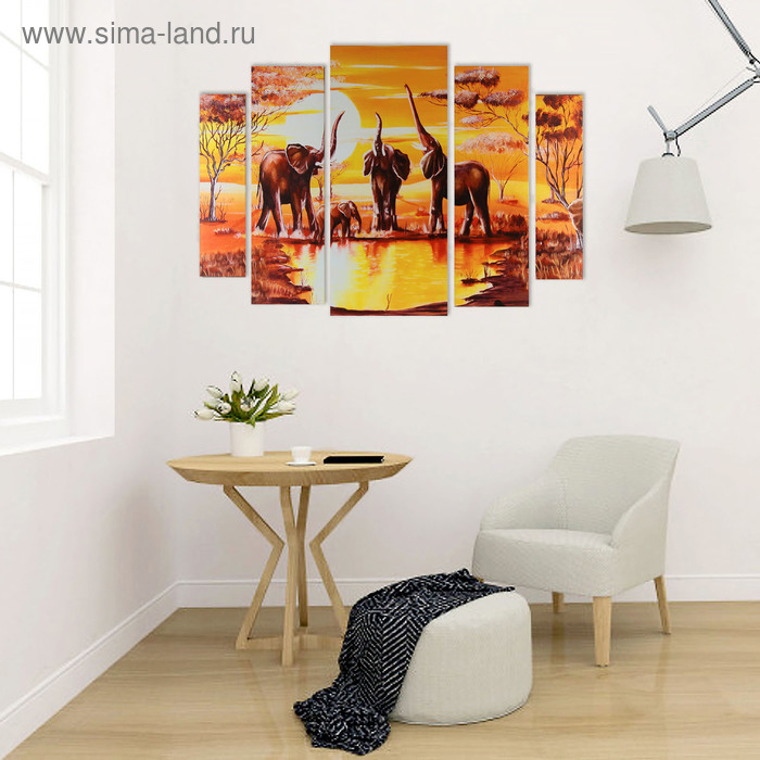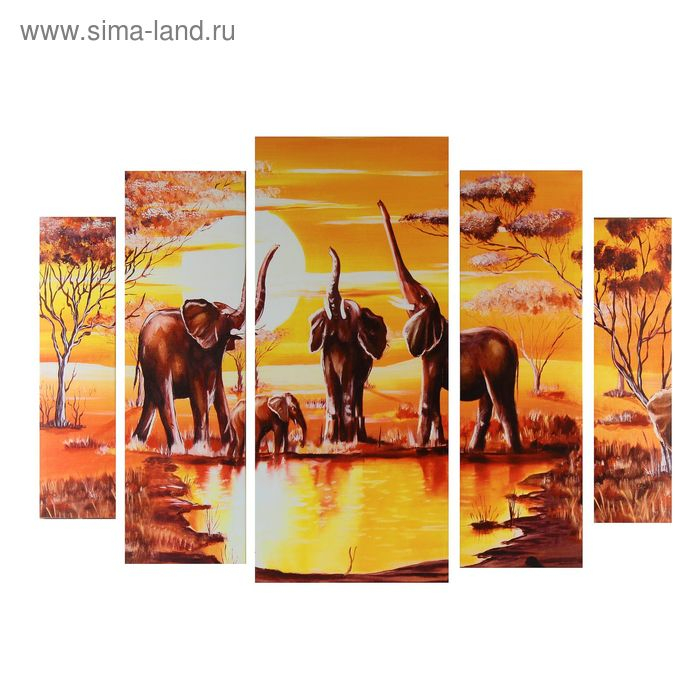 Картина модульная на подрамнике "Слоны на водопое" 2-14х53, 2-21х69,5 1-34х79; 80х118см