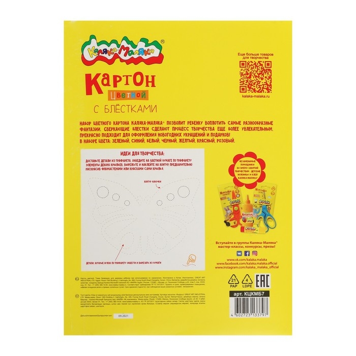 По стандартам качества Каляки-Маляки блестки остаются на картоне и бумаге, а не на руках!Мелованные листы идеально складываются, прекрасно клеятся и отлично подходят как для украшения аппликации, так и для оформления подарков и открыток.