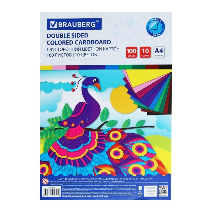 Картон цветной двухсторонний А4, 100 листов, 10 цветов, плотность 220 г/м2, BRAUBERG Kids series, тонированный