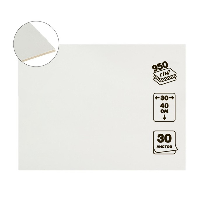 Картон переплётный 1.5 мм, 30 х 40 см, 30 листов, 950 г/м², белый