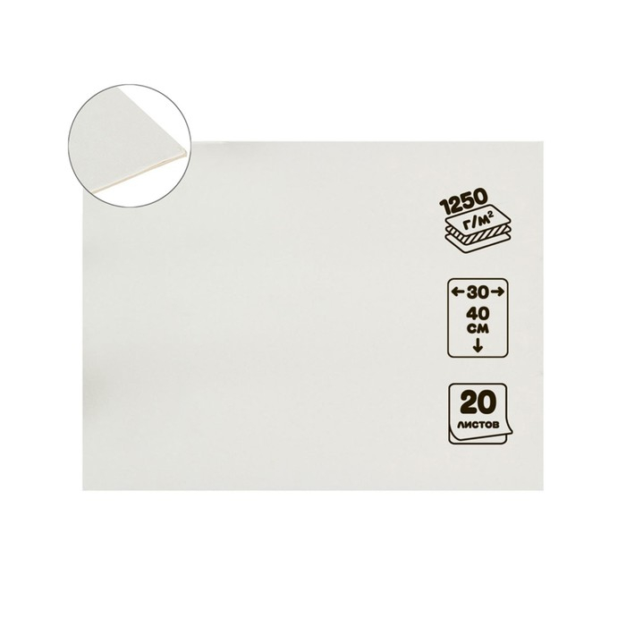 Картон переплётный 2.0 мм, 30 х 40 см, 20 листов, 1250 г/м², белый