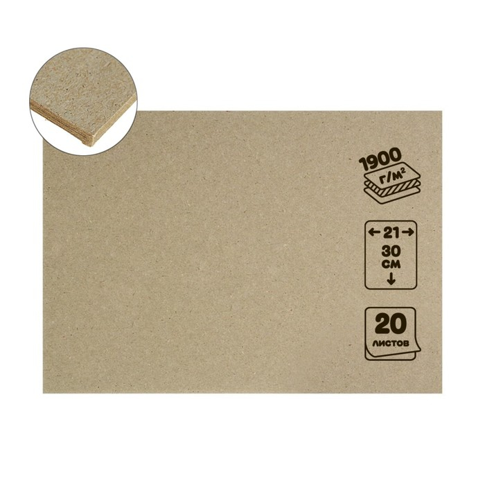 Картон переплётный 3.0 мм, 21 х 30 см, 20 листов, 1900 г/м2, серый