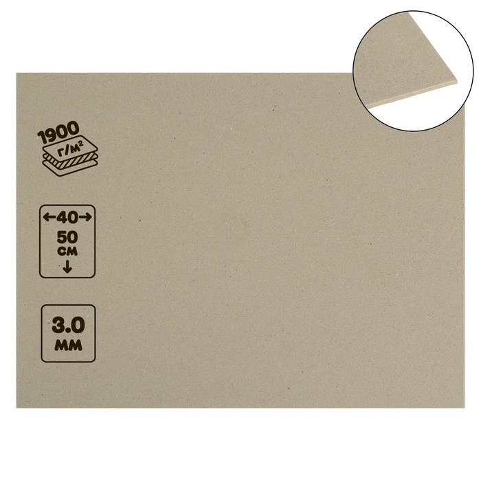 Картон переплётный (обложечный) 3.0 мм, 40 х 50 см, 1900 г/м2 серый