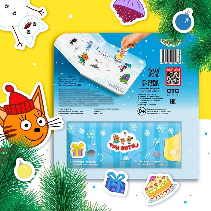 Картонная книга с липучками «Новогодние липучки», 12 стр., 23 липучки, Три кота