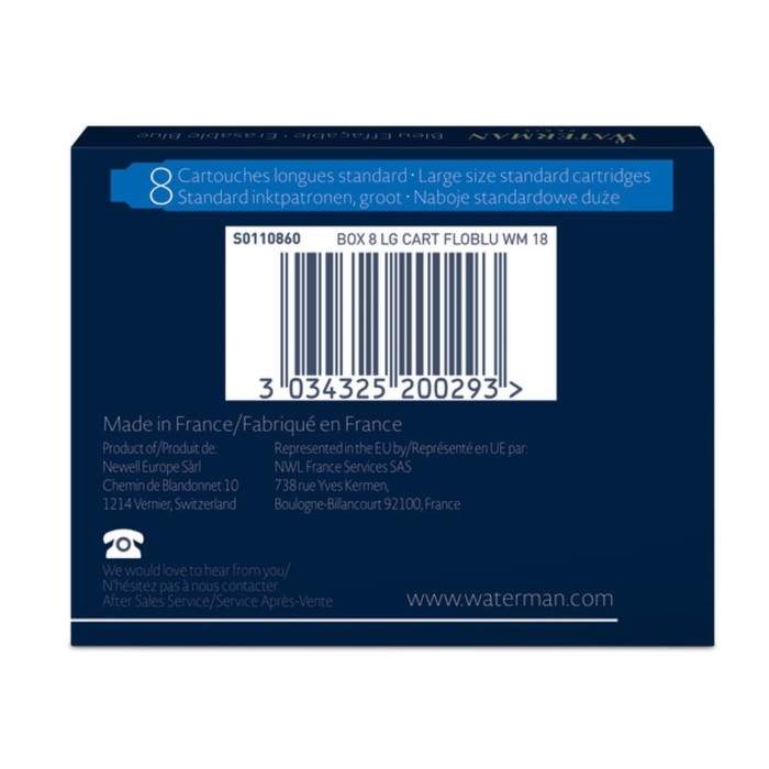 Картриджи ддя перьевой ручки набор 8шт Waterman Standard, синие, блистер S0110860
