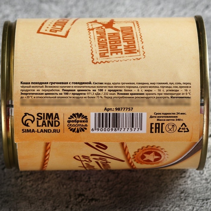 Состав: вода, крупа гречневая, говядина, жир говяжий, лук, соль, перец черный молотый, возможно наличие в незначительных количествах яичного порошка, сухого молока, горчицы, сои, орехов, и продуктов их переработки.