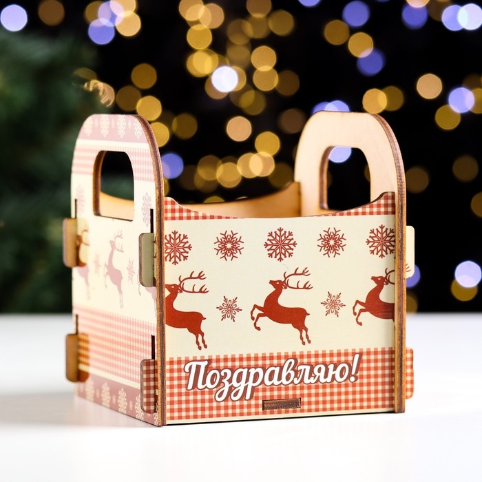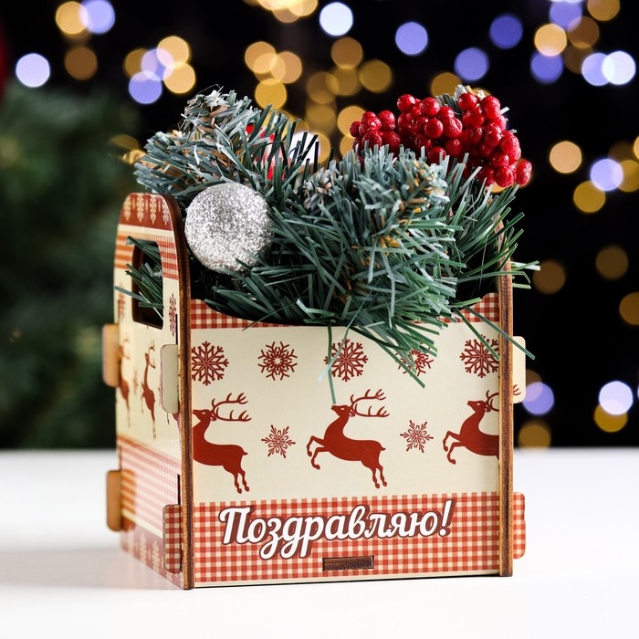 Кашпо деревянное "Олени новогодние, Поздравляю!", 10×10.5×11 см
