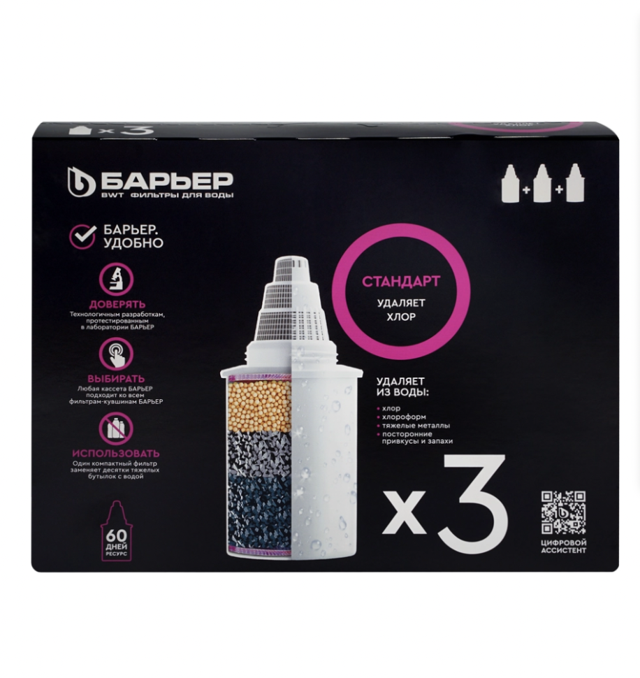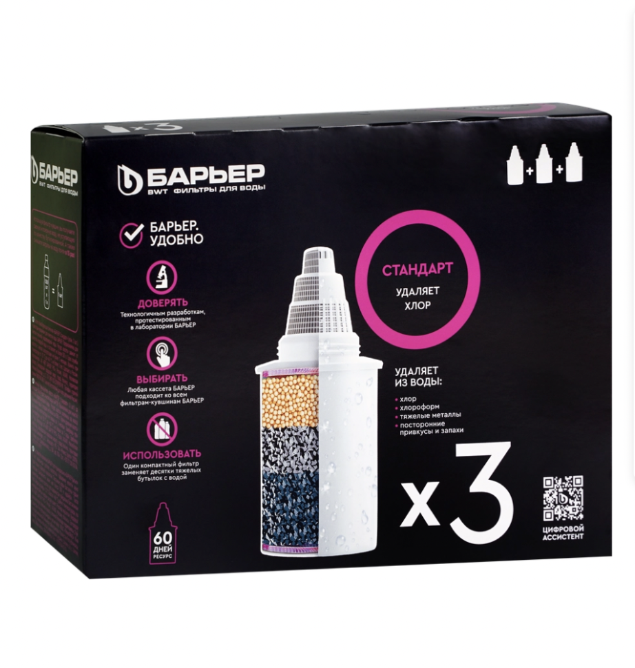 Россия. Кассета сменная БАРЬЕР Барьер-4 Стандарт надежно удерживает мельчайшие частицы вредных химических соединений и веществ, а также нейтрализует посторонние привкусы и запахи питьевой воды. Ионообменная смола удаляет тяжелые металлы и железо, а технология NanoPlus увеличивает эффективность и ресурс компонентов сменного модуля. Кокосовый активированный уголь, обработанный серебром, предотвращает рост бактерий. Фильтр тонкой очистки устраняет мельчайшие механические примеси. Картридж имеет рабочий ресурс до 350л. Подходит ко всем фильтрам-кувшинам БАРЬЕР. В упаковке 3шт.