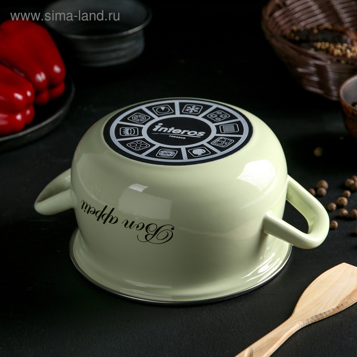 Эмалированная кастрюля Interos из качественной стали, покрытой двухслойной стеклокерамической эмалью, отлично подходит для приготовления и хранения различных блюд.