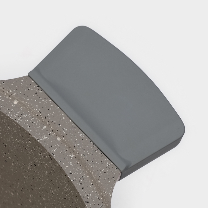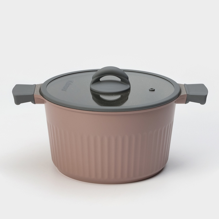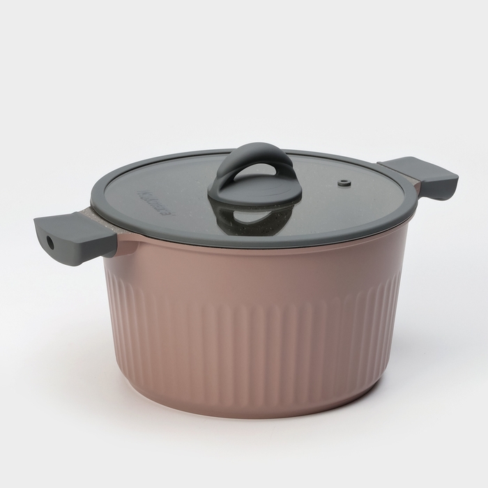 Изящная крышка из жаропрочного стекла с защитным ободком приятного цвета, удобной, не нагревающейся бакелитовой ручкой создает герметичную атмосферу внутри. Кроме этого по краям посуды имеются две эргономичные бакелитовые ручки серого цвета с нескользящим покрытием soft-touch.