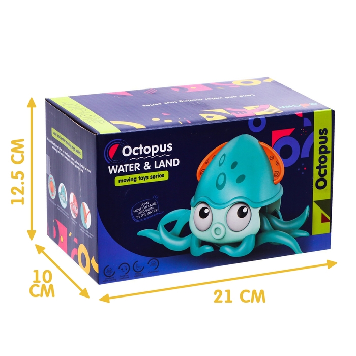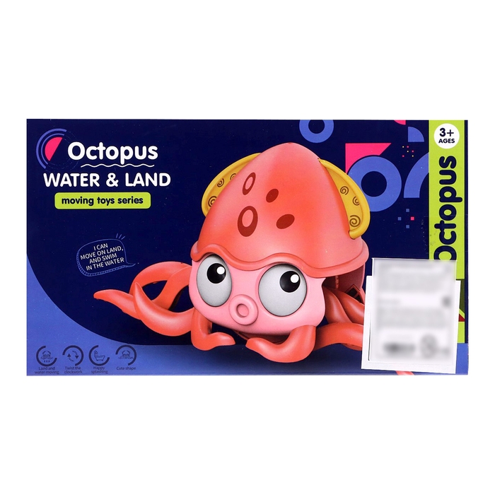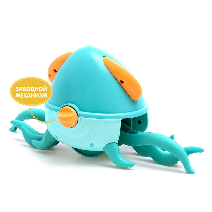 В игрушку встроен заводной механизм, он расположен сзади. Если его повернуть и отпустить потом игрушку, то осьминог самостоятельно поползёт или поплывёт, если опустить его в воду.
