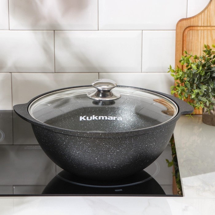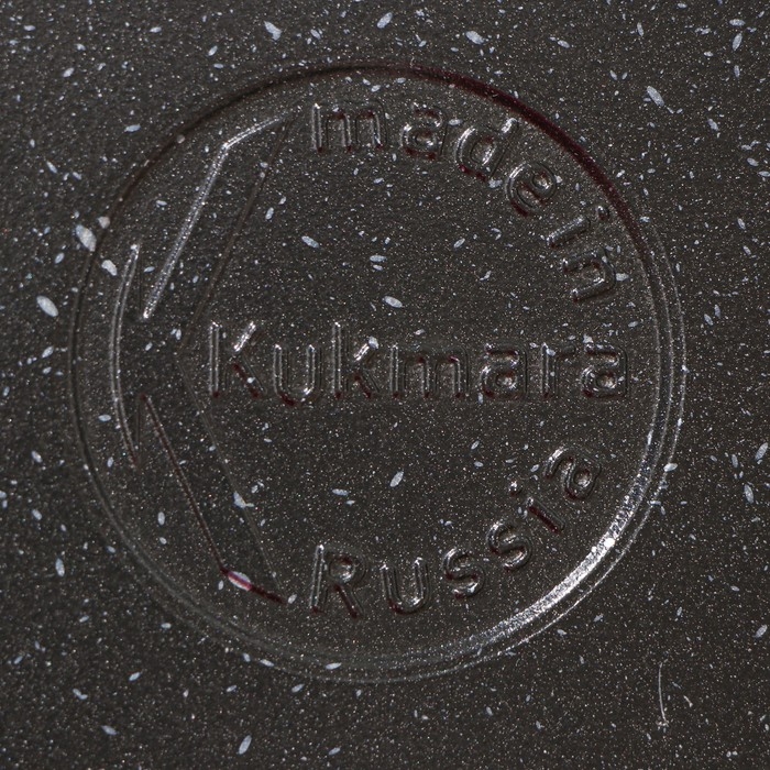 Посуда Kukmara «Мраморная» изготовлена из литого алюминия и покрыта инновационным антипригарным мраморным покрытием на водной основе, усиленным сверхтвёрдыми частицами минералов.