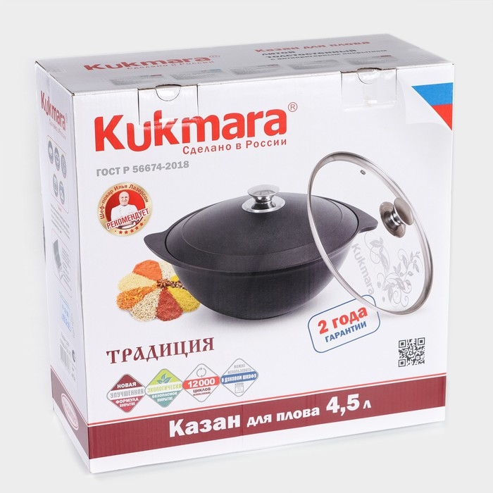 Продукция Kukmara изготовлена из литого алюминия и покрыта немецким высококачественным антипригарным покрытием на водной основе, усиленным сверхпрочными минеральными частицами.