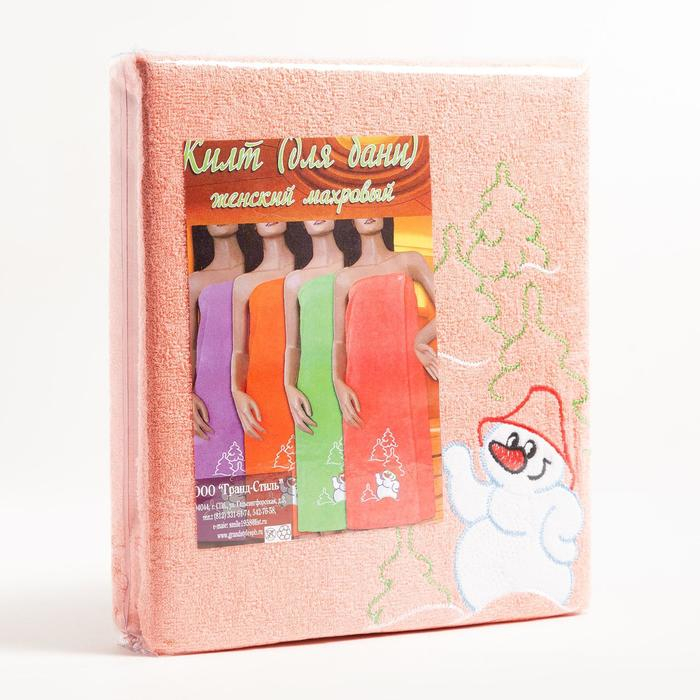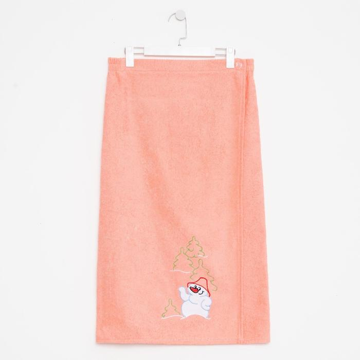 Килт женский для бани и сауны, цвет персиковый вышивка Снеговик, размер 80х150±2 см, махра 300г/м 100% хлопок