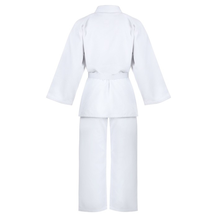 Кимоно предназначено для занятий дзюдо. Изготовлено из хлопка и полиэстера, ткань хорошо впитывает влагу и пропускает воздух. В комплект входят белый пояс, куртка и брюки с дополнительным уплотнением колен.