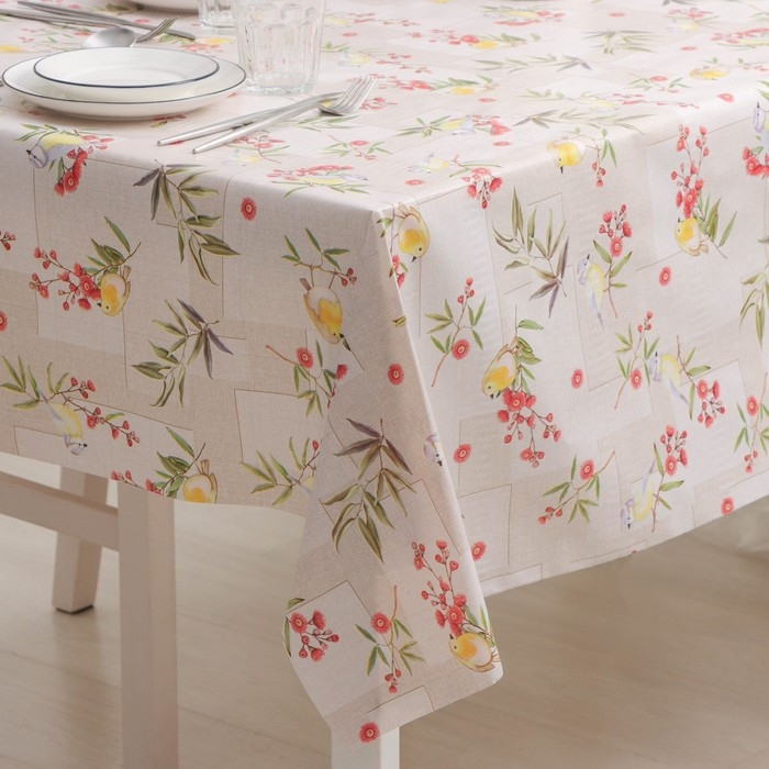 Клеёнка на нетканевой основе «Птички» в 3–4 раза прочнее обычных аналогов. Такой материал не мнётся и не деформируется. ПВХ-основа делает клеёнку максимально простой в уходе. Любая грязь устраняется быстро: с помощью простой влажной тряпочки вы без особых усилий приведёте стол в порядок.