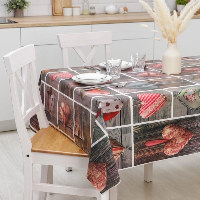 Клеёнка на тканевой основе «Сердца» в 3–4 раза прочнее обычных аналогов. Такой материал не мнётся и не деформируется. ПВХ-основа делает клеёнку максимально простой в уходе. Любая грязь устраняется быстро: с помощью простой влажной тряпочки вы без особых усилий приведёте стол в порядок.