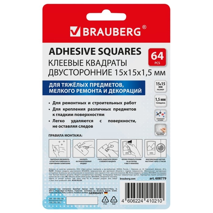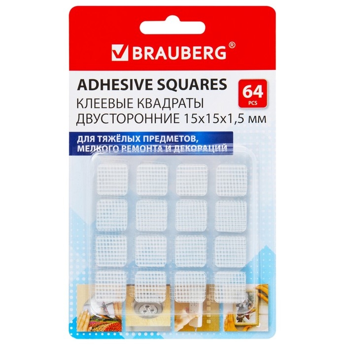 Клеевые квадраты двусторонние, 15 мм х 15 мм, акриловая основа, 64 шт., BRAUBERG