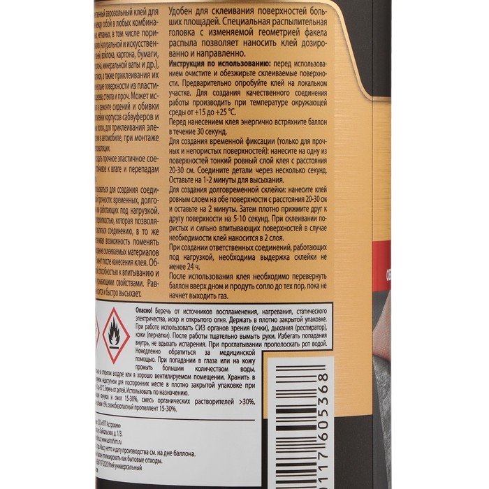 ASTROhim Клей-спрей - высококачественный аэрозольный клей для склеивания между собой в любых комбинациях тканных, нетканых, в том числе пористых материалов (натуральной и искусственной кожи, тканей, войлока, картона, бумаги, резины, поролона, минеральной ваты и др.), дерева, пластиков, а также приклеивания их на твердые несущие поверхности из пластика, металла, дерева, стекла и проч. Может использоваться в ремонте сидений и обивки салона, для оклейки корпусов сабвуферов и музыкальных полок, для приклеивания элементов отделки в автомобиле, при монтаже шумо- и теплоизоляции.